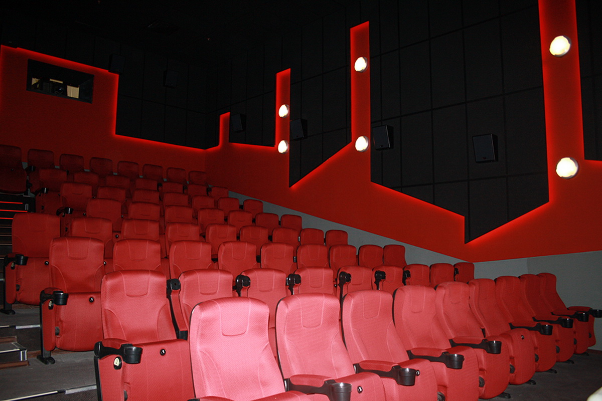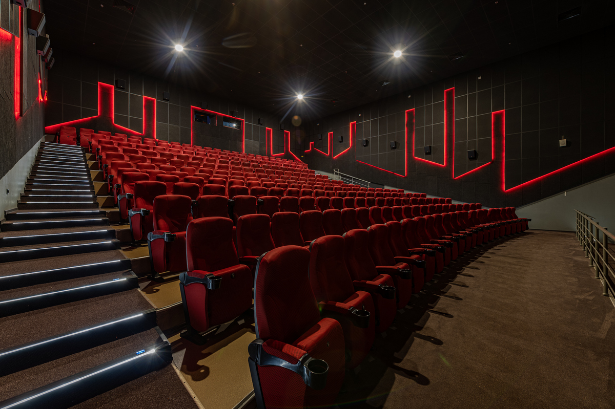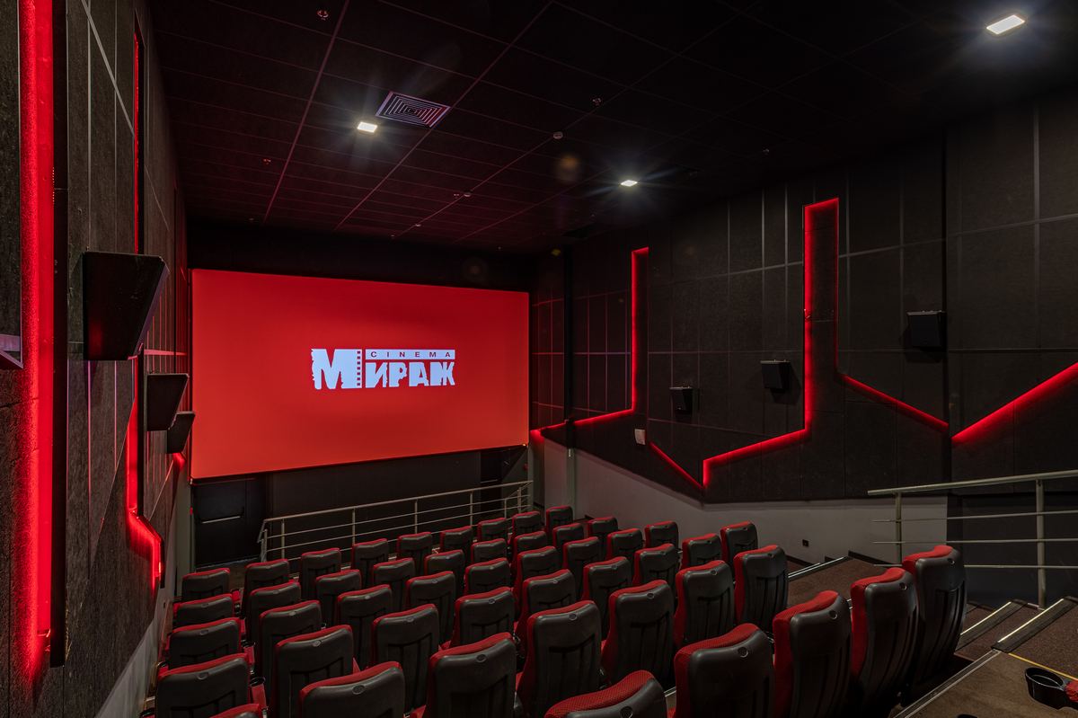 В кинозалах черные стены с красной подсветкой создают завораживающую мистическую атмосферу